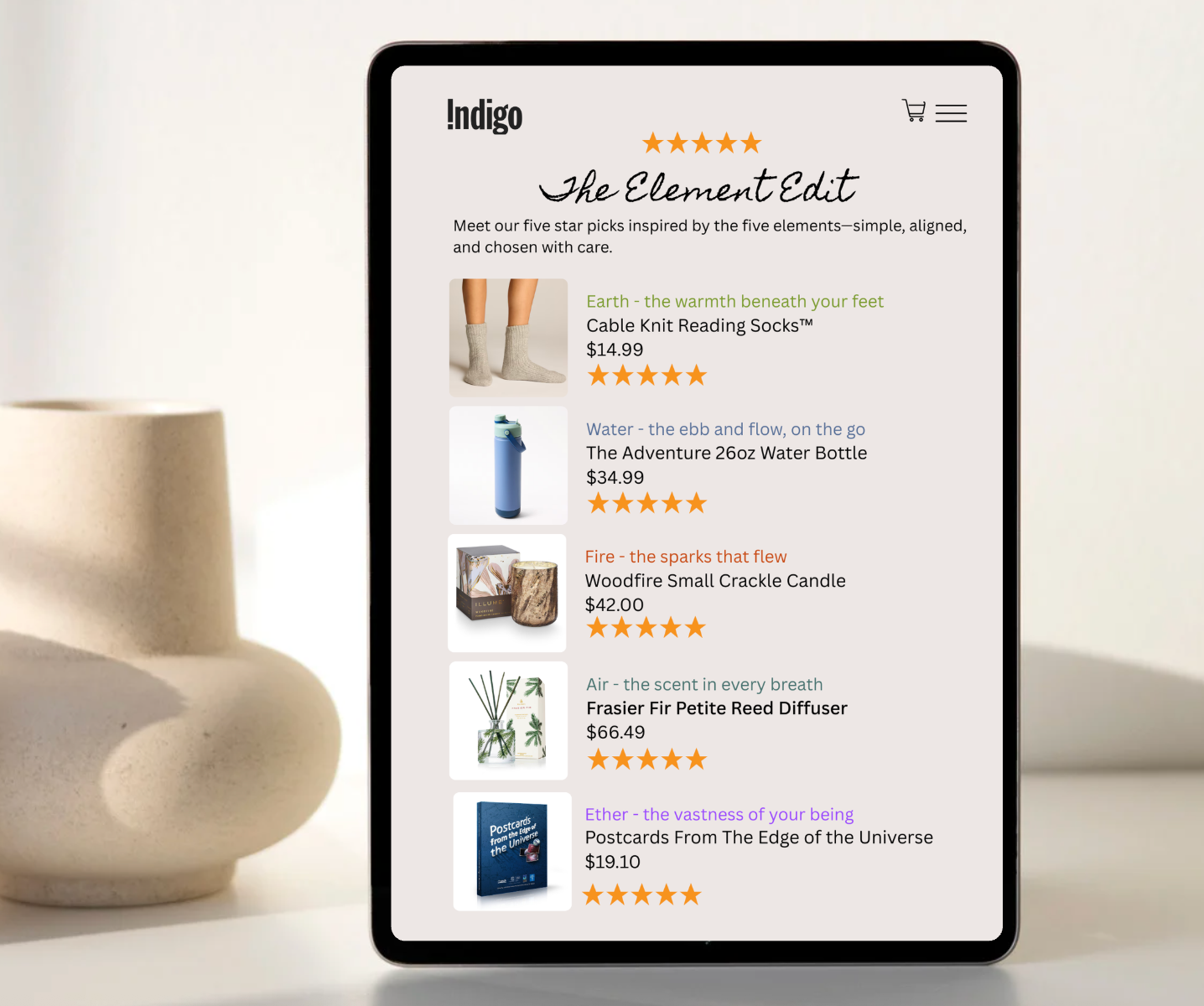 A digital product catalog for Indigo's five-star products inspired by The Five Elements.