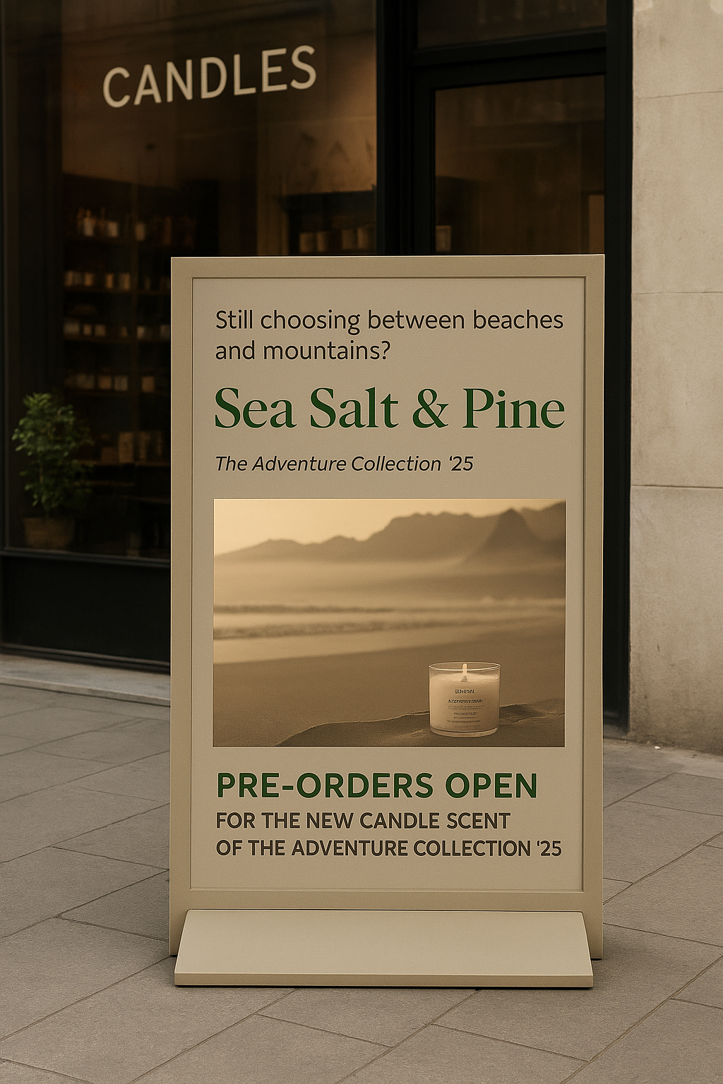 A retail standee introducing a candle scent for those who don't choose between terrains.